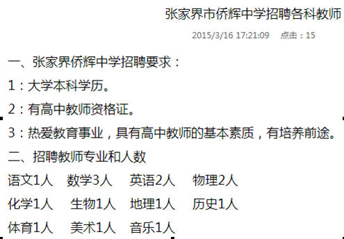 张家界侨辉中学招聘各科教师