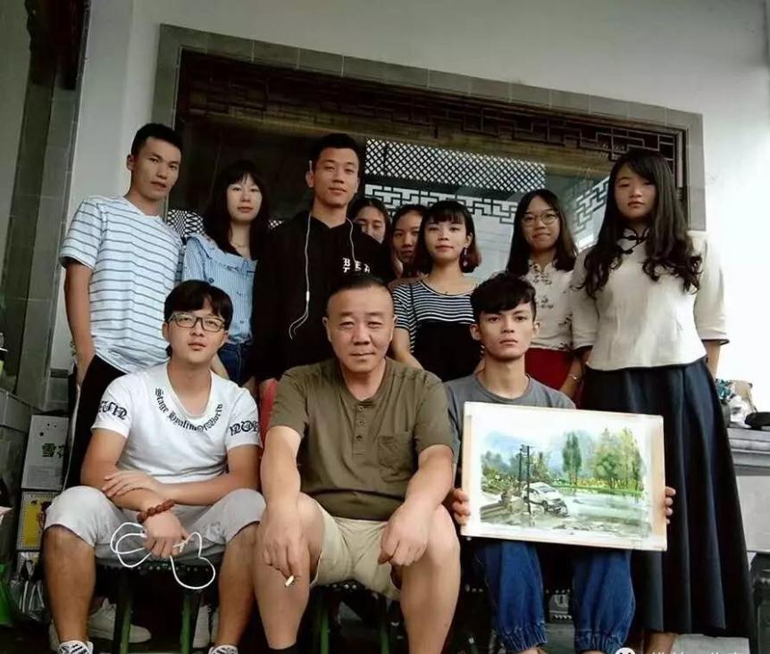(旷昌龙教授示范完画后与15级水彩班学生合影)