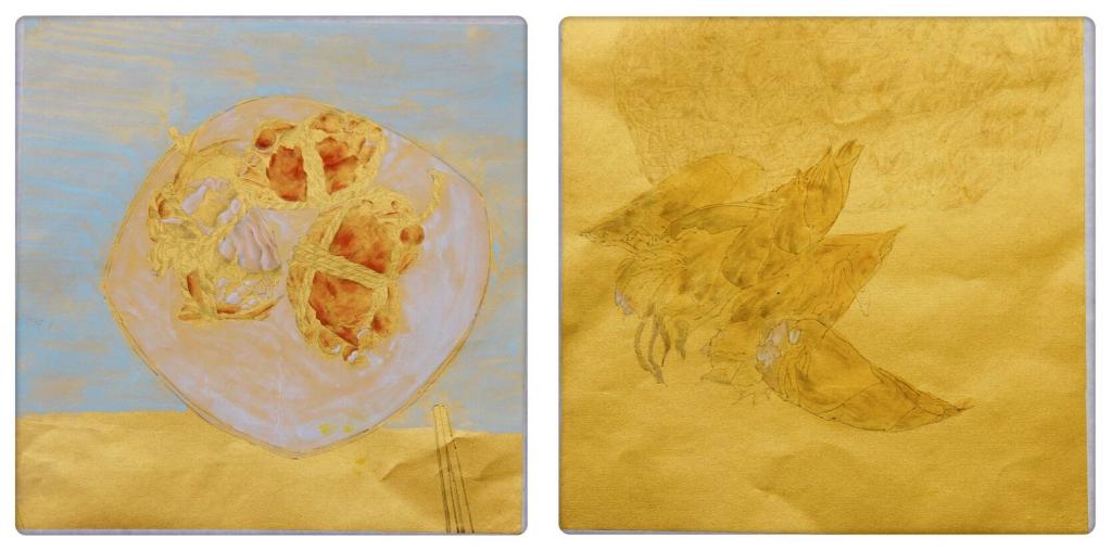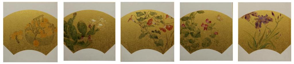 张龄方的《细若花闻》小品系列创作选取寻常所见的蔬果花卉为题材,在材质上选取金笺卡纸,色调统一。画面略有古意,技法主要以没骨积色为主,辅以草虫,朴实生动,不失为一组优秀的小品系列创作。