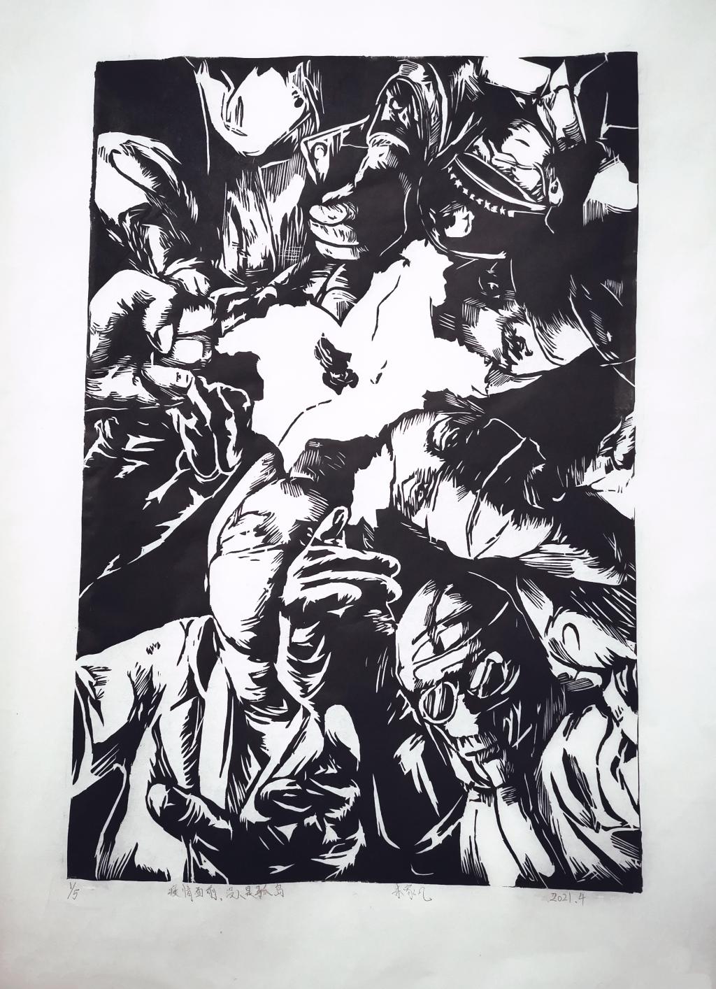 《疫情面前,没人是孤岛》是米家凡同学对于疫情的有感而发,以独特的视角,用其所学的版画专业知识,将热点时政转化成自己的作品。表达了各行各业的人群在疫情下团结一心,众志成城的景象。作品有着类似插画的感觉,打破了传统构图和比例关系,服务于内容本身,不失为一件真诚的作品。