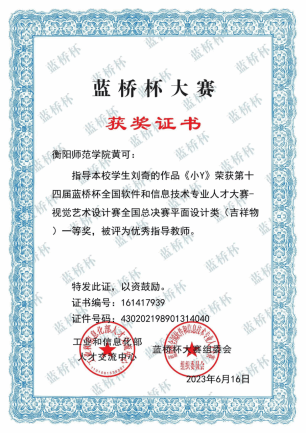 2023年6月16日,工业和信息化部人才交流中心主办的第十四届“蓝桥杯”视觉艺术设计赛平面设计类(吉祥物)全国总决赛获奖名单公布,我院2020级视觉传达专业刘奇同学的作品《小Y》喜获一等奖,黄可老师被评为优秀指导老师。