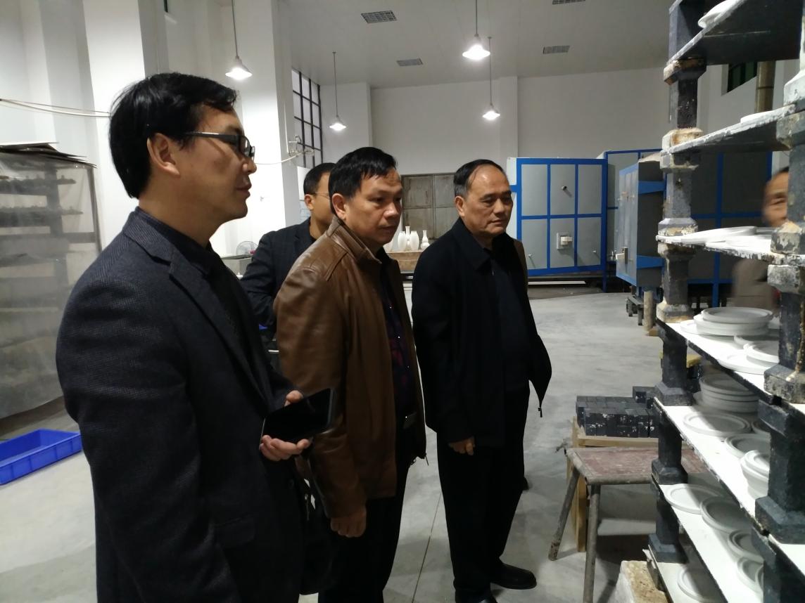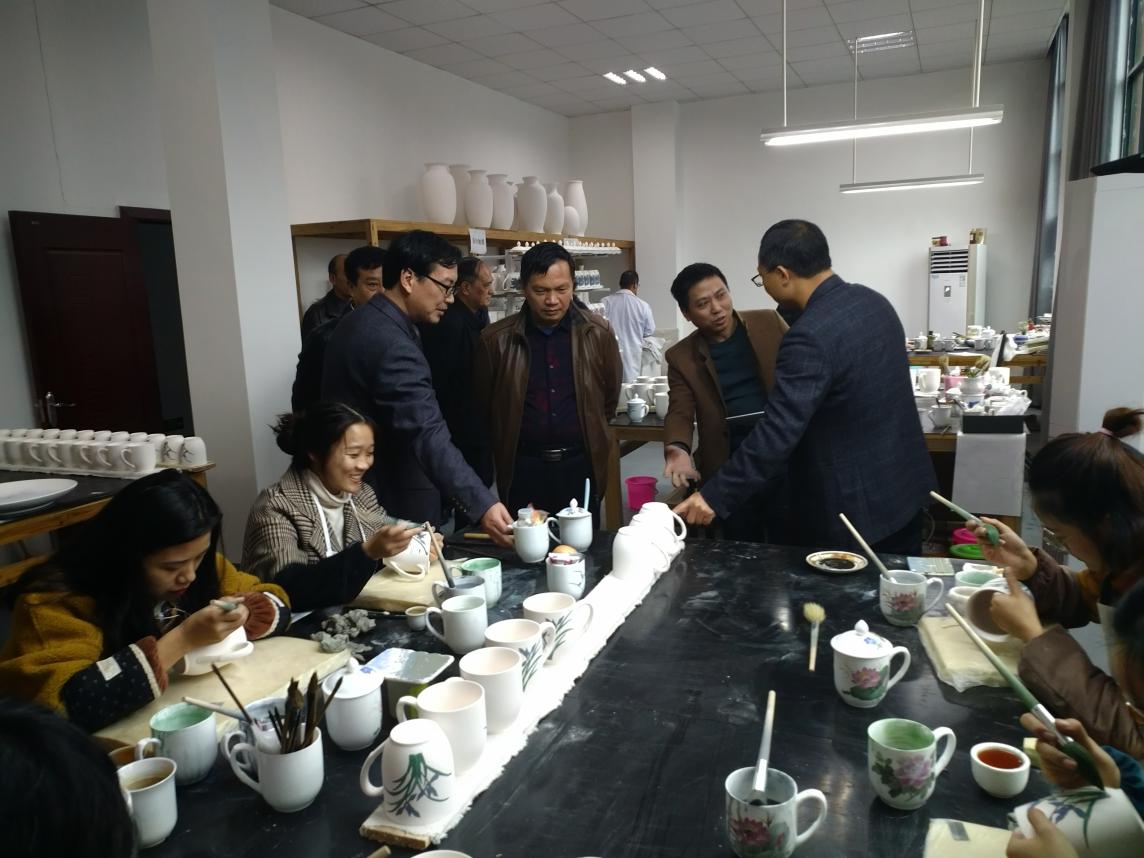 11月13日下午,伟德bv1946原党委书记许金生、纪委书记唐国华前往湖南神州界牌瓷业有限公司,考察victor1946绘画专业基地建设,教务处副处长刘典文,victor1946院长叶经文、副院长王志成全程陪同考察。